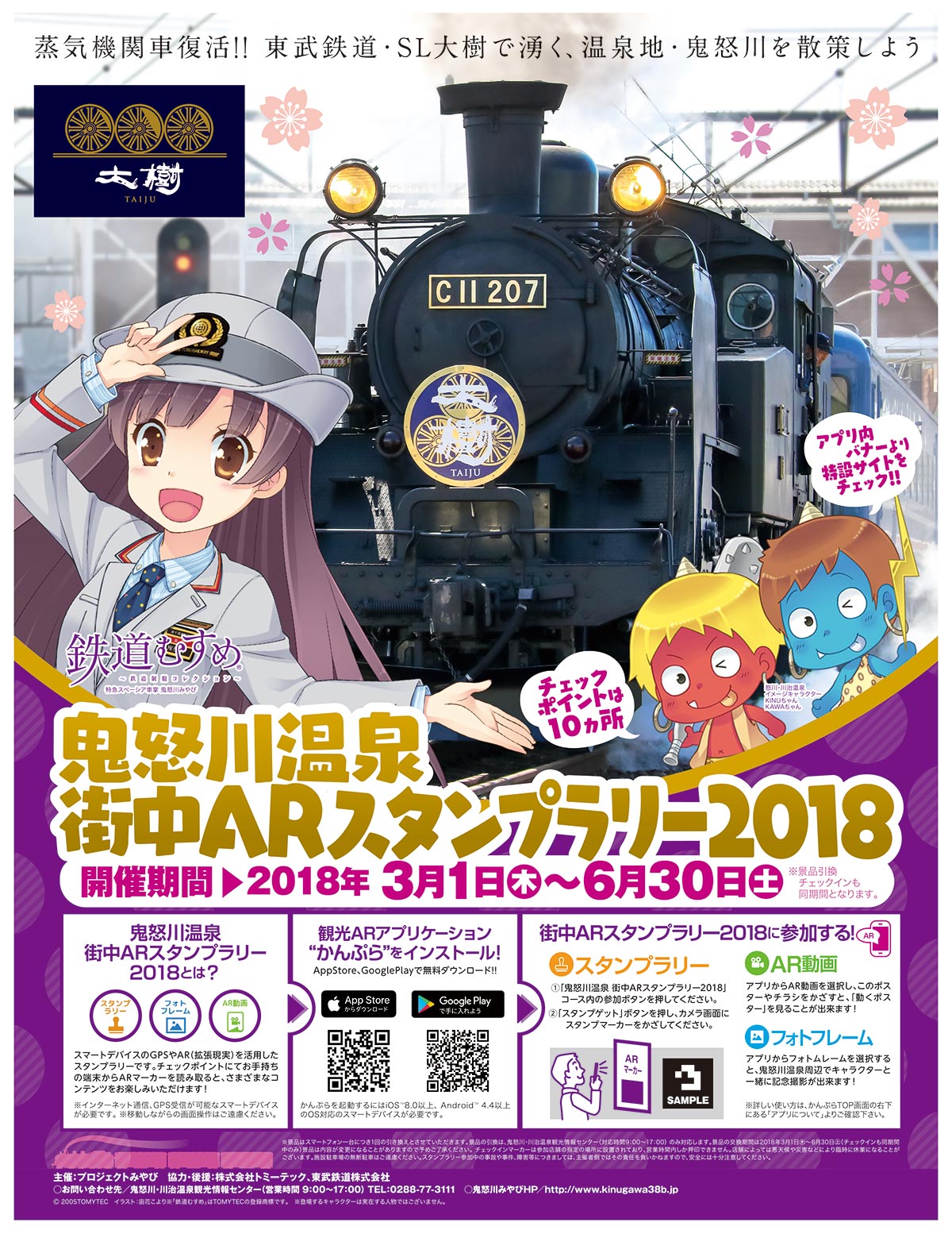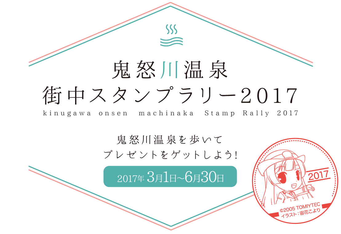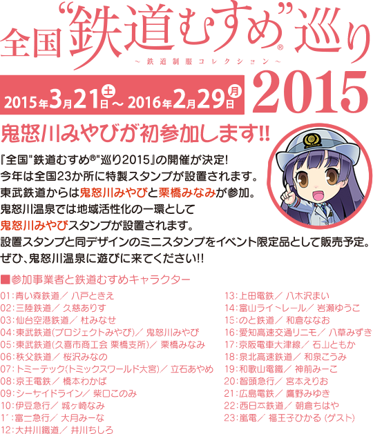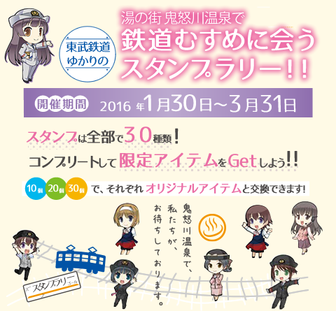 鬼怒川・川治温泉観光情報センター(鬼怒川温泉駅前)をスタート地点に、鬼怒川温泉街6箇所に設置された「鬼怒川みやび」をはじめとする東武鉄道ゆかりの鉄道むすめなどのキャラクタースタンプを、温泉街の周遊を楽しみながら集めていただくスタンプラリーを開催します。各施設にてお買物していただくと押印することができるスタンプを、すべて集めていただいた方には、もれなく鉄道むすめオリジナルグッズをプレゼントします。